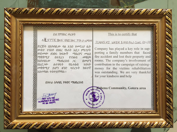 近期,在我辦事處所在地社區(qū)居民Alemayehu Bekele家不幸遭遇無情火災(zāi)、家庭陷入極度困境的時刻,江西水建駐埃分公司向其伸出援手,助其迅速重建家園。事后,Gotera社區(qū)協(xié)調(diào)員及警察所官員一行為我公司這種義舉表示贊賞并頒發(fā)了感謝證證書。