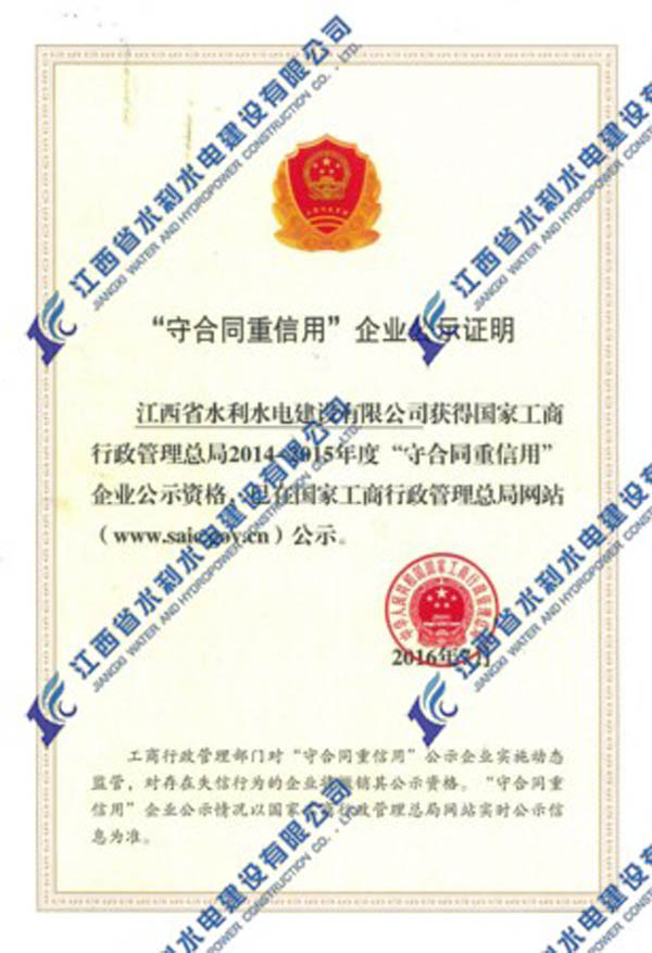 2016年我公司首次榮獲國家工商行政管理總局2014-2015年度“守合同重信用”企業(yè)公示資格。“守合同重信用”公示活動,是工商部門依托合同行政監(jiān)管職能組織開展的旨在推進企業(yè)信用建設(shè)的“守重”企業(yè)公示活動,是長期以來我國社會信用體系建設(shè)的重要組成部分。
